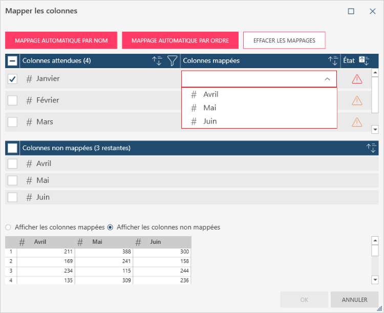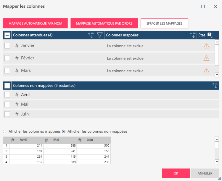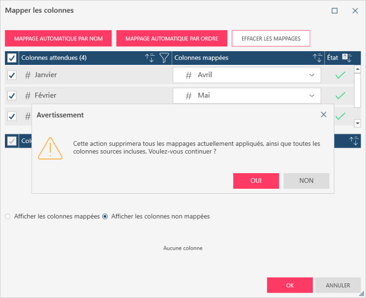 Notez que la section inférieure de la boîte de dialogue et l’aperçu qui s’affiche quand vous cliquez sur le bouton Afficher les colonnes non mappées sont désormais vides.