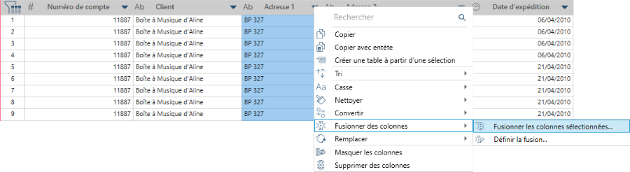 Vous pouvez fusionner des colonnes facilement, en les mettant en surbrillance et en sélectionnant Fusionner les colonnes. Vous avez le choix entre réaliser une fusion rapide ou créer la fusion à l’aide de la boîte de dialogue Définir la fusion.