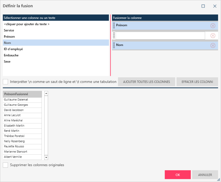 Cochez la case Supprimer les colonnes originales si vous voulez supprimez les colonnes d’origine (c.-à-d. non fusionnées) de la table résultante.