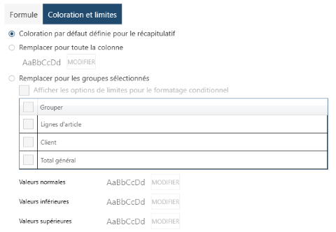 Coloration par défaut définie pour le récapitulatif : Sélectionnez cette option pour utiliser les valeurs par défaut définies dans la boîte de dialogue Modifier un récapitulatif.