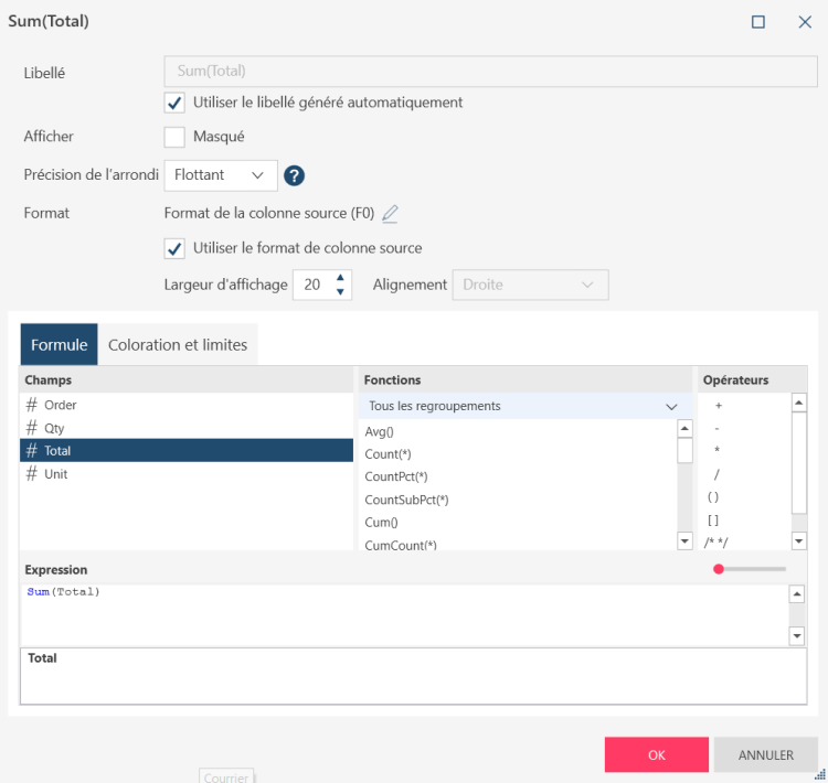Si vous voulez modifier le calcul appliqué à ce champ de mesure, saisissez un nouveau calcul (par ex. une expression arbitraire impliquant addition, soustraction, multiplication et division des valeurs des colonnes numériques) dans le champ Expression.