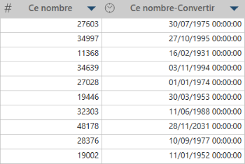 Monarch Data Prep Studio convertit les nombres en dates en considérant que les valeurs numériques représentent un nombre de jours (et de fractions de jours) qui se sont écoulés depuis la date/heure « zéro ».