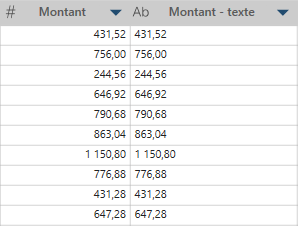 Dans cet exemple, Montant est la colonne d'origine et Montant – texte contient les valeurs converties :