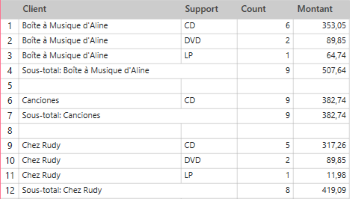 Figure 4. Ventes, par client et par type de support. La colonne Décompte affiche le nombre de transactions et la colonne Montant, le montant total des ventes pour chaque clé.