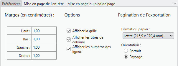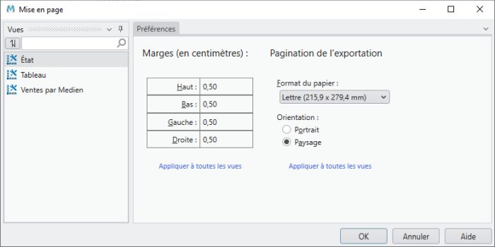Boîte de dialogue Mise en page