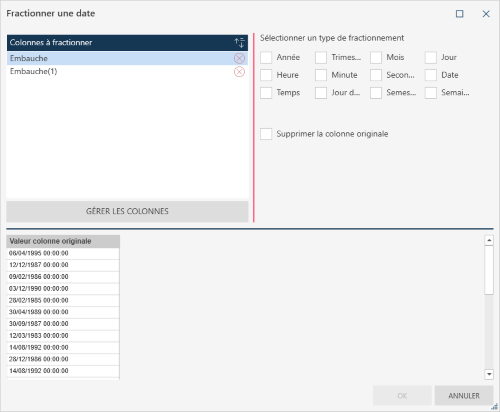 Fractionne un champ date/heure en deux, ou en colonnes, en fonction des composants date/heure sélectionnés. |