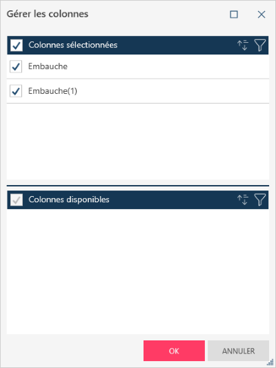 (S’affiche uniquement quand une colonne masquée existe dans une table.) Affiche la liste des colonnes masquées. Le fait de sélectionner une colonne dans cette liste la fait de nouveau apparaître dans la table. |