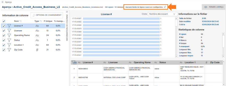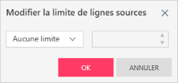 Vous pouvez limiter le nombre de lignes à exploiter en cliquant sur l’icône Modifier en regard de Aucune limite de lignes sources configurée (applicable si aucune limite n’a été définie pour le nombre de lignes) ou Limite de lignes (applicable si une limite a été définie auparavant).