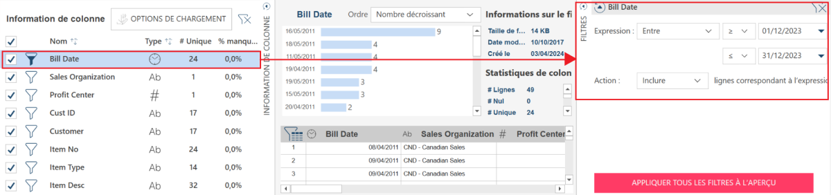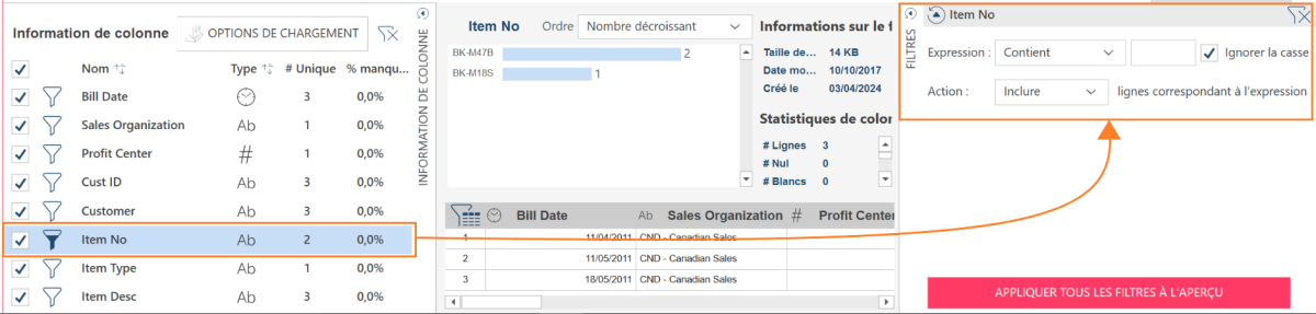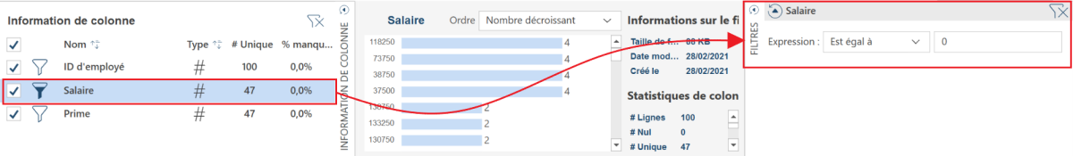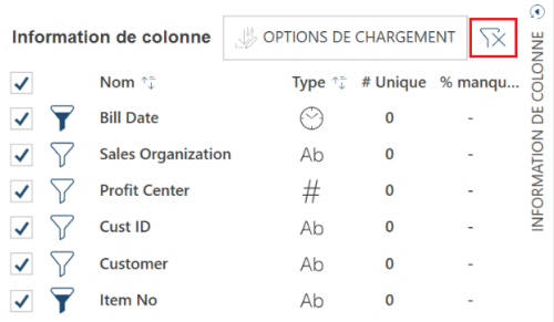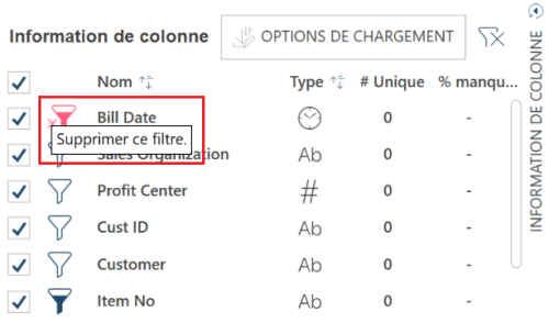 Pour supprimer tous les filtres définis à la fois, cliquez sur l’icône Effacer les filtres sur la droite du panneau Information de colonne.