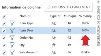Affiche diverses statistiques sur les colonnes dans le sous-panneau Statistiques sur les colonnes .