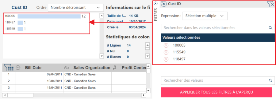 Dans la fenêtre Aperçu, les filtres pour les champs numériques sont créés de la même façon que les filtres pour les champs de texte.
