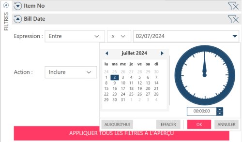 Quand vous créez des filtres de date/heure, vous pouvez spécifier des valeurs de calendrier et/ou de format d’heure. Pour ce faire, cliquez sur les boutons de menu déroulant en regard des champs de date/heure dans la boîte de dialogue Filtre de (date/heure). Les commandes Calendrier et Horloge s’affichent pour vous aider à sélectionner la date et l’heure souhaitées, respectivement.