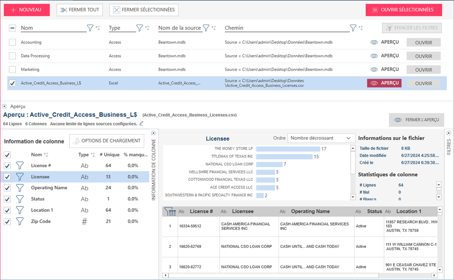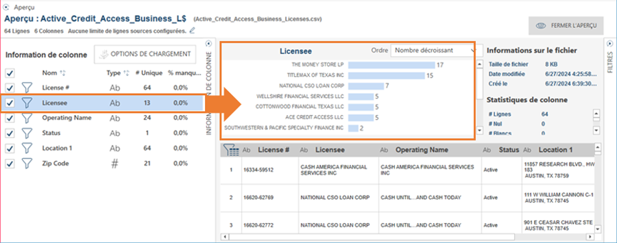 L’aperçu des données est un aspect important de la préparation des données, car il vous permet de passer en revue vos données et d’en vérifier la qualité avant de les charger dans l’espace de travail de Monarch Data Prep Studio.