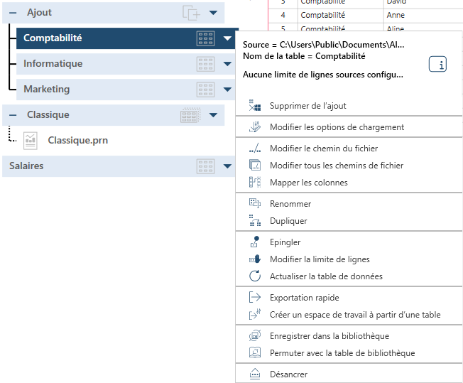 Dans la fenêtre Préparer, cliquez sur l’icône de liste déroulante située sur la droite de la table que vous désirez actualiser.