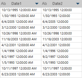 Dans cet exemple, Date1 est la colonne d'origine et Date2 est la nouvelle colonne obtenue après application de la fonction Supprimer les caractères alpha :