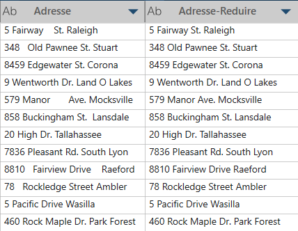 Dans cet exemple, Adresse est la colonne d'origine et Adresse-Reduire contient les nouvelles valeurs, sans les espaces consécutifs :