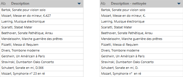 Dans cet exemple, Description est la colonne d'origine et Description - nettoyeé est la nouvelle colonne obtenue après application de la fonction Supprimer les caractères numériques :