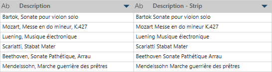 Dans cet exemple, Description est la colonne d'origine. L'opération Supprimer les caractères spécifiés est utilisée pour supprimer le tiret « , » afin de produire les valeurs qui se trouvent dans la colonne Description - Strip.