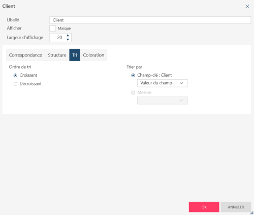 Pour trier le champ sur la base des valeurs d’une mesure, sélectionnez l’option Mesure. Par exemple, pour trier un champ Région constitué de plusieurs régions commerciales (Nord, Sud, Est et Ouest) en fonction des montants totaux des ventes, vous sélectionneriez l’option Mesure suivie de la mesure de votre choix – en l’occurrence la mesure des ventes totales de chaque région.