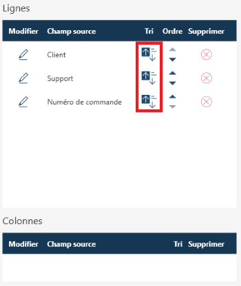 Les champs qui composent votre définition de récapitulatif et peuvent être triés s’affichent dans les panneaux Lignes, Éléments et Colonnes de ces boîtes de dialogue. Les mesures ne peuvent pas être triées.