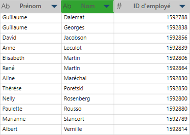 La colonne est triée dans l’ordre croissant par défaut. L’arrière-plan de l’en-tête vire du bleu au vert pour indiquer que la table est trié en fonction de cette colonne :