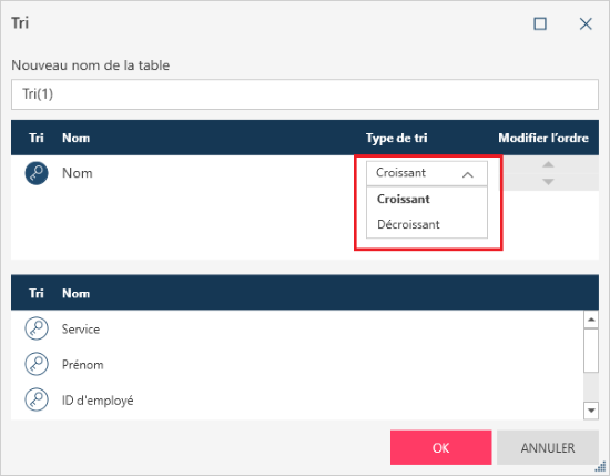 Définissez le type de tri en sélectionnant Croissant ou Décroissant dans le menu déroulant Type de tri en regard d’une colonne de tri.