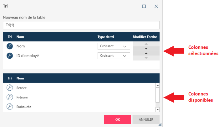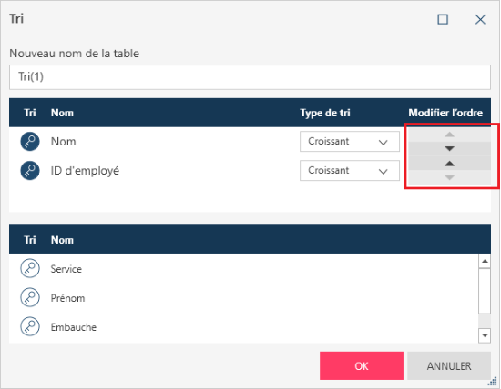 Monarch Data Prep Studio effectue le tri en fonction de l’agencement des colonnes de tri. Vous pouvez en changer l’ordre en cliquant sur les flèches haut/bas en regard d’une colonne.