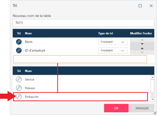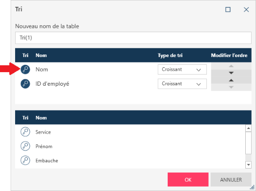 Cliquez sur l’icône de clé pour déplacer la colonne de la liste des colonnes à la liste des colonnes de tri :