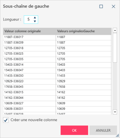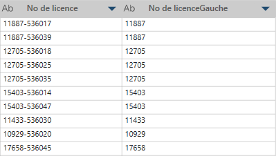 Dans cet exemple, la première colonne (No de licence) est la colonne d'origine. Cinq caractères du côté gauche sont extraits pour produire les valeurs dans la deuxième colonne :