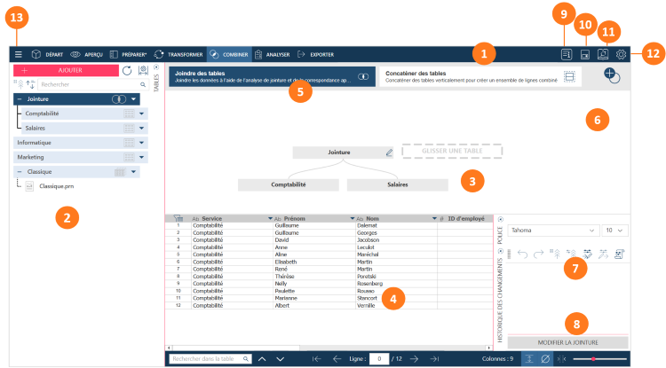 L’étape Combiner permet de joindre ou de concaténer deux tables ou plus. Vous pouvez sélectionner l’opération à effectuer dans un menu déroulant quand vous cliquez sur l’outil Combiner.