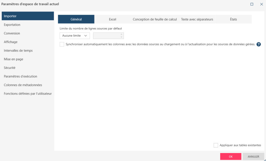 Spécifie une limite de lignes pour permettre le chargement partiel des données de fichiers extrêmement volumineux et améliorer ainsi les performances de l’application. Pour ce faire, dans la liste déroulante proposée, sélectionnez l’option Limite. Dans le champ qui s’affiche à sa droite, spécifiez la limite de nombre de lignes à appliquer lors de l’ouverture de tables. Remarques :