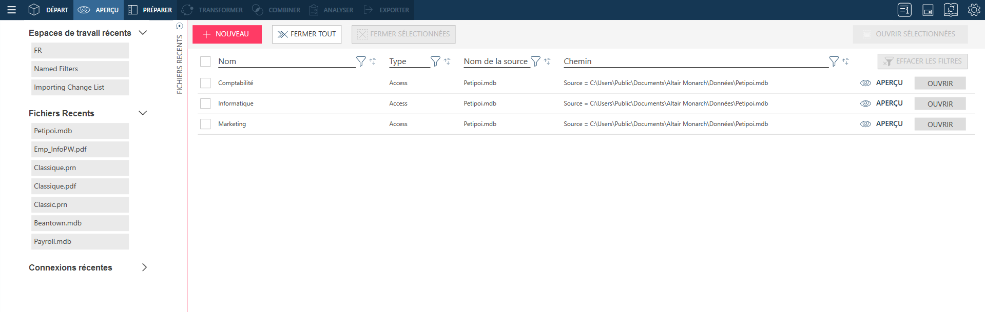 Ce volet se développe ou se réduit en cliquant sur le bouton Fichiers récents. Lorsqu'il est développé, il affiche une liste de tous les espaces de travail, fichiers et connexions récents utilisés dans l'application. |