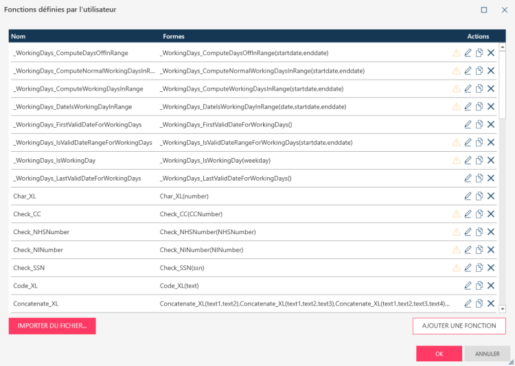 La boîte de dialogue Fonctions définies par l’utilisateur s’affiche. Cette boîte de dialogue contient la liste de toutes les fonctions définies par l’utilisateur disponibles pour l’espace de travail et la forme. Vous pouvez modifier, copier et supprimer n’importe laquelle de ces fonctions en sélectionnant le bouton approprié dans la colonne Actions. Vous pouvez également ajouter une fonction à partir de cette boîte de dialogue ou importer des fonctions à partir d’un modèle ou d’un fichier d’espace de travail.