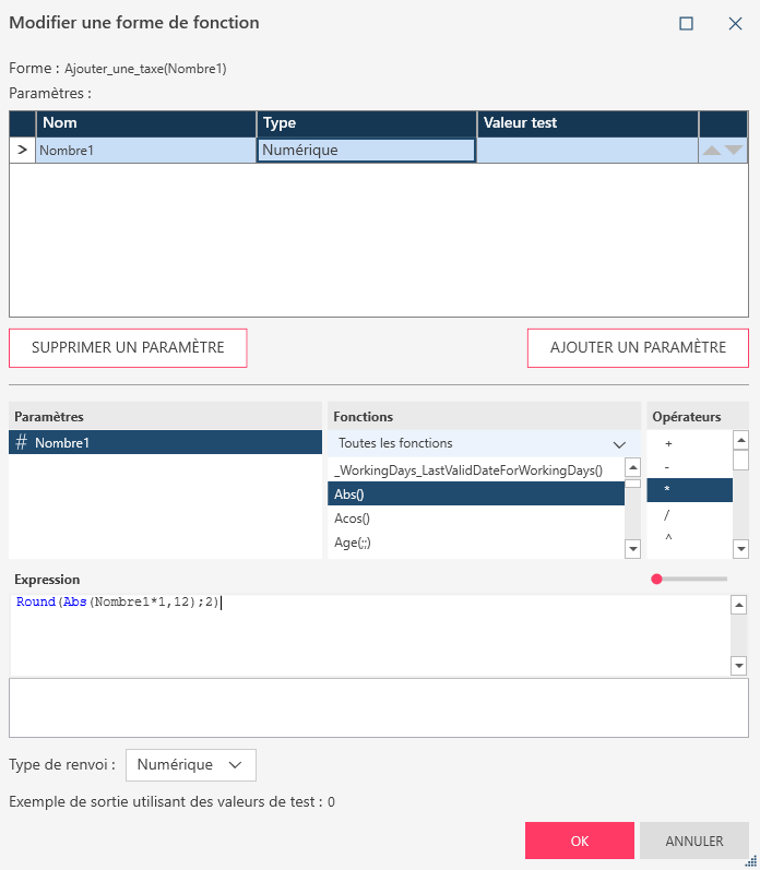 - Construisez la fonction dans la zone Expression. Par exemple, si vous souhaitez calculer le montant brut d’un nombre quelconque après application d’une taxe de 12 % arrondie à deux chiffres, vous pouvez créer l’expression"Round(Abs(Number1)+(0.12*Number1),2)"