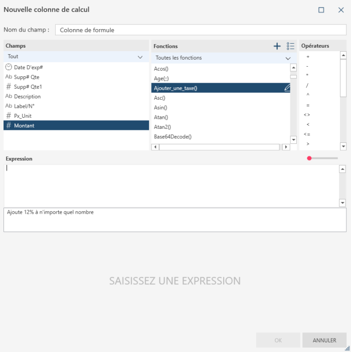 - Construisez l’expression de calcul en utilisant les valeurs disponibles dans les colonnes Champs, Fonctions et Opérateurs.