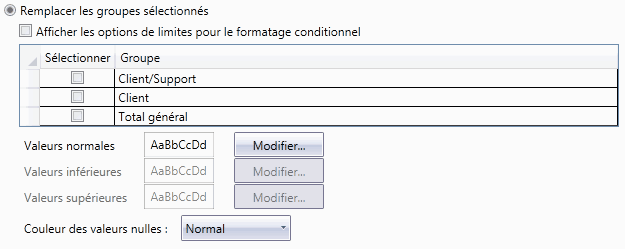 Si vous souhaitez définir des couleurs pour le formatage conditionnel, cliquez sur Afficher les options de limites pour le formatage conditionnel. L'écran vous permettra d'indiquer les limites inférieure et supérieure pour chaque groupe :