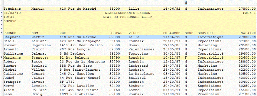 Dans le graphique illustré ci-dessous, remarquez le « M » mis en surbrillance sur la ligne de sélection. Ce « M » sert actuellement à limiter la capture aux données relatives aux employés de sexe masculin (remarquez que les données du sixième employé de la liste, « Marianne Stancort », ne sont pas capturées).
