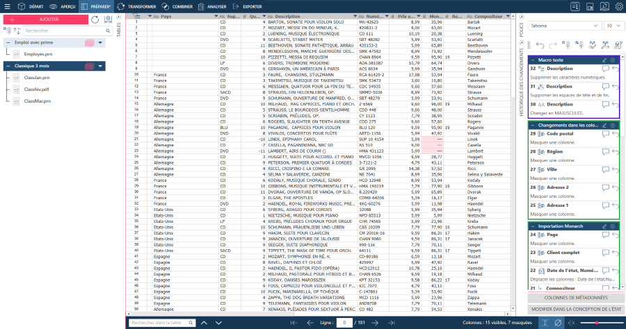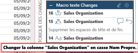Par exemple, les changements associées à un modèle et à un état dans un projet créé dans Monarch Classic et ouvert dans Data Prep Studio seront regroupés en tant que changements « Monarch Import ». Lorsqu’une macro texte comporte plusieurs changements (par exemple, suppression des espaces en début et en fin de texte + passage en majuscules), ces changements sont regroupés sous l’appellation « Macro texte ». Autre exemple, tous les changements apportés à partir de la boîte de dialogue Liste des colonnes sont regroupés sous l’appellation « Changements de la liste des colonnes ».