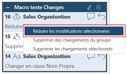 Si, au lieu de réduire tout un groupe de changements, vous souhaitez réduire des changements individuels du groupe, utilisez CTRL+Clic pour sélectionner les changements à réduire, puis cliquez avec le bouton droit de la souris. Dans le menu contextuel, choisissez Réduire le changement/Réduire les changements sélectionnés.