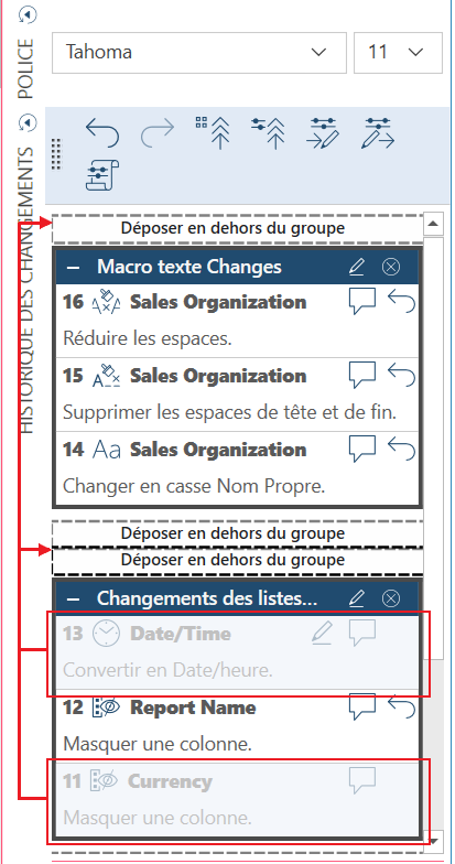 Vous pouvez également sélectionner un ou des changements à retirer du groupe et les glisser-déposer n’importe où dans la liste de l’historique des changements.