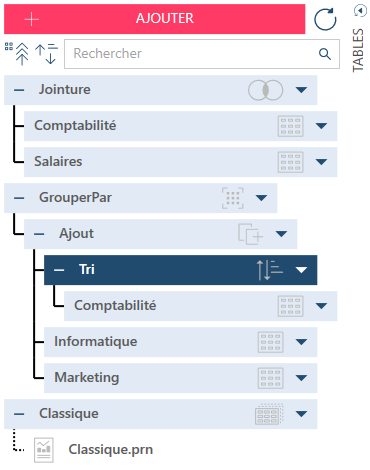 Notez que les plans de chargement pour les opérations de tri n’ont pas le même comportement que les plans de chargement pour les autres opérations de transformation. Quand on applique une opération de tri à la table Comptabilité dans l’exemple ci-dessus, la nouvelle table s’affiche immédiatement uniquement au-dessus de la table concernée (c.-à-d. la table Comptabilité), pas la table Groupement, comme on pourrait s’y attendre avec les autres transformations, et il n’y a pas de nouveau plan de chargement créé.