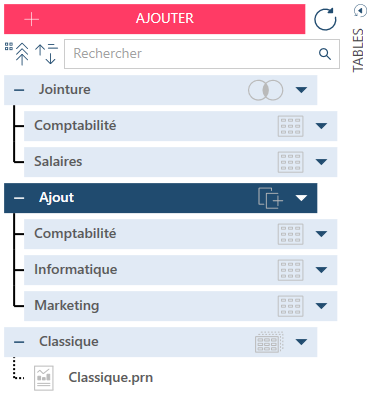 Dans la liste des tables ci-dessous, par exemple, les tables Jointure et Concaténation sont le résultat d’opérations de jointure et concaténation, respectivement.
