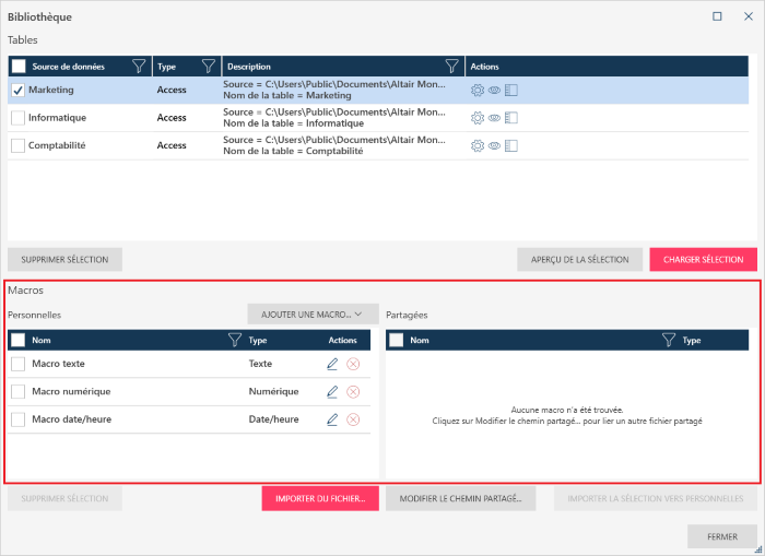Partagées – Les macros partagées sont celles créées par d’autres utilisateurs dans leurs propres espaces de travail et enregistrées dans un fichier de collection de macros (.dpmc). Vous pouvez importer ces fichiers dans votre espace de travail et les exploiter comme s’ils étaient les vôtres.