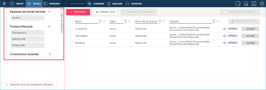Quand un élément est sélectionné dans la liste des espaces de travail récents, fichiers récents et connexions récentes, il s’ouvre et se charge dans la fenêtre Aperçu. Vous pouvez sélectionner ces éléments de la manière habituelle et les charger dans la fenêtre Préparer.