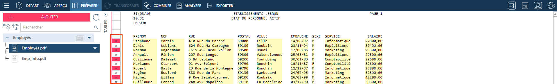 Les documents état ou PDF ouverts dans Data Prep Studio par le biais de la Conception de l’état s’affichent dans la fenêtre Préparer comme des nœuds parent/enfant.