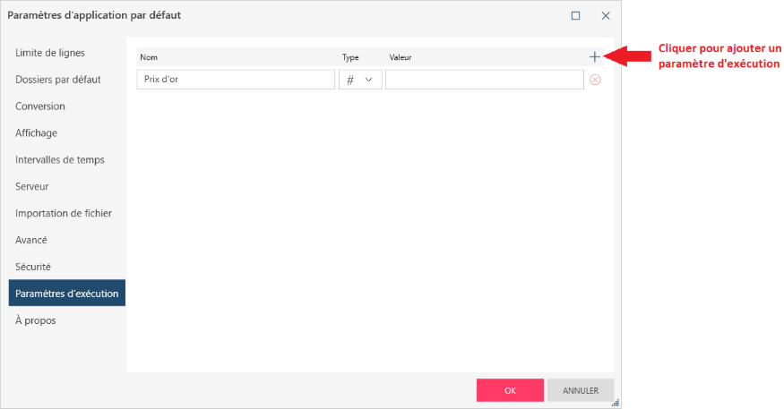 La boîte de dialogue Nouveau paramètre d’exécution s’affiche :