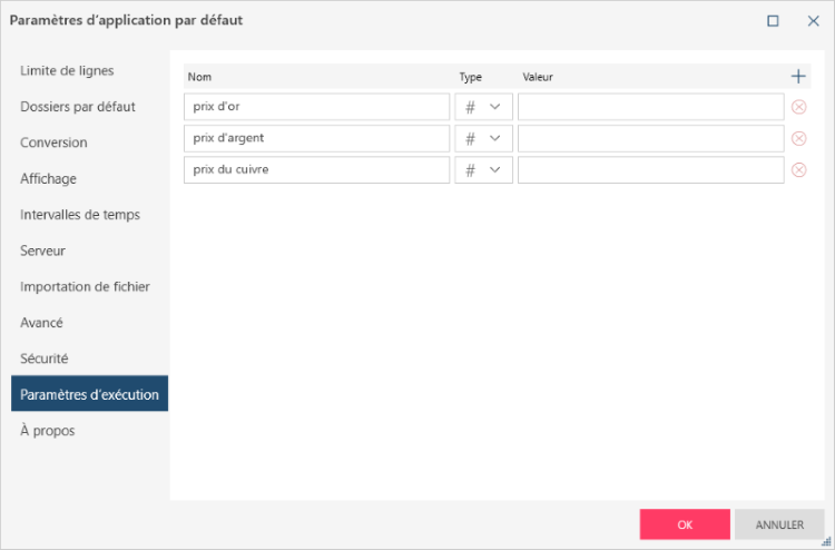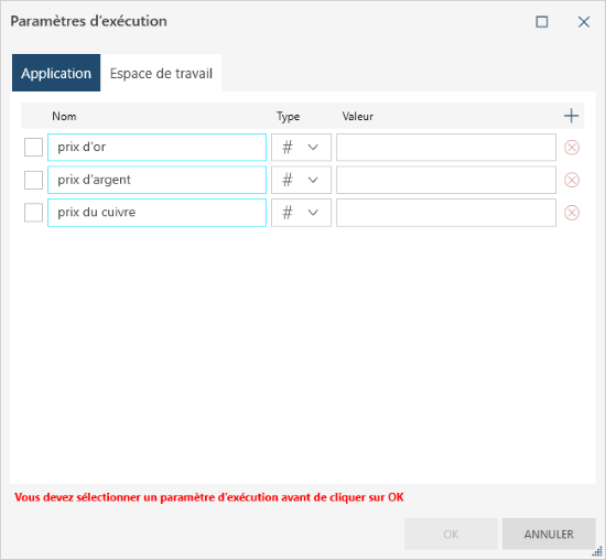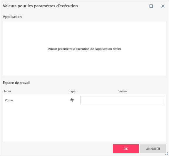 Ouvrez l’espace de travail. La boîte de dialogue Valeurs pour les paramètres d’exécution s’affiche :