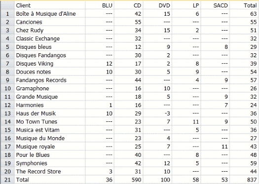 Champ numérique comportant la somme de chaque groupe de valeurs uniques des champs-clés d'un récapitulatif. Par exemple, dans le récapitulatif à clé horizontale suivant concernant un distributeur de musique, le champ Quantité comporte la somme de tous les groupes de valeurs uniques identifiées dans les champs Client et Support, produisant la quantité de chaque type de support vendu à chaque client.