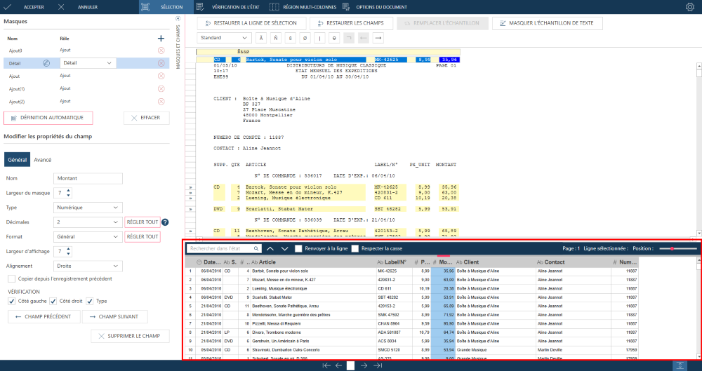 Par exemple, dans la figure ci-dessus, la ligne rouge délimite un masque d’exclusion. Ce masque permettra la capture du numéro de commande et de la date d’expédition de tous les enregistrements, même si ces détails sont sélectionnés à l’aide de deux points.