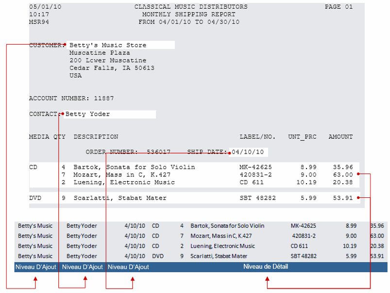 Beaucoup d’états sont triés à plusieurs niveaux. Ainsi, dans l’état illustré ci-dessous, les articles sont triés par client et par date d’expédition. Le client représente en l’occurrence le plus haut niveau de tri, et la date d’expédition, le niveau suivant. Les champs de transaction se trouvent au niveau de détail. Si votre fichier d’état comporte plusieurs niveaux de tri, vous devez définir un masque différent pour chaque niveau de données à extraire.
